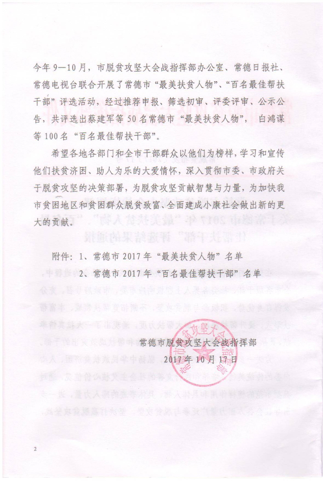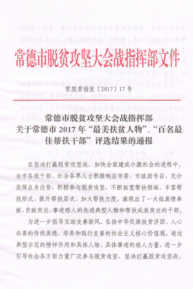 關(guān)于常德市2017年“最美扶貧人物”、“百名最佳幫扶干部”評選結(jié)果通報(bào)